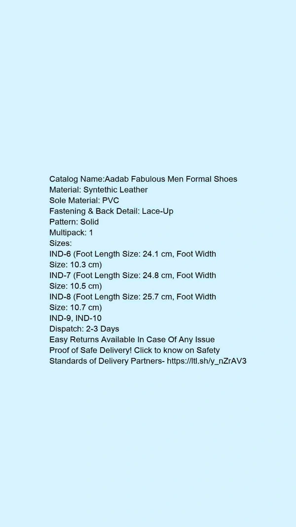 Catalog Name:*Aadab Fabulous Men Formal Shoes*Material: Syntethic LeatherSole Material: PVCFastening & Back Detail: Lace-UpPattern: SolidMultipack: 1