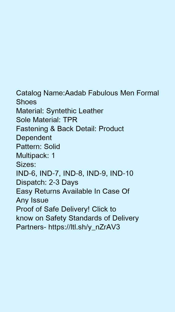 Catalog Name:*Aadab Fabulous Men Formal Shoes*Material: Syntethic LeatherSole Material: TPRFastening & Back Detail: Product DependentPattern: SolidMultipack: 1