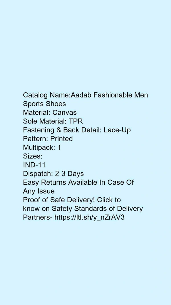 Catalog Name:*Aadab Fashionable Men Sports Shoes*Material: CanvasSole Material: TPRFastening & Back Detail: Lace-UpPattern: PrintedMultipack: 1
