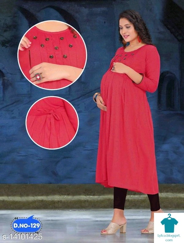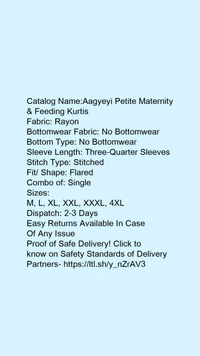 Catalog Name:*Aagyeyi Petite Maternity & Feeding Kurtis*Fabric: RayonBottomwear Fabric: No BottomwearBottom Type: No BottomwearSleeve Length: Three-Quarter SleevesStitch Type: StitchedFit/ Shape: FlaredCombo of: Single