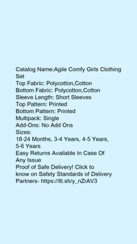 Catalog Name:*Agile Comfy Girls Clothing Set*Top Fabric: Polycotton,CottonBottom Fabric: Polycotton,CottonSleeve Length: Short SleevesTop Pattern: PrintedBottom Pattern: PrintedMultipack: SingleAdd-Ons: No Add Ons