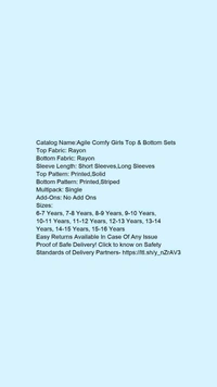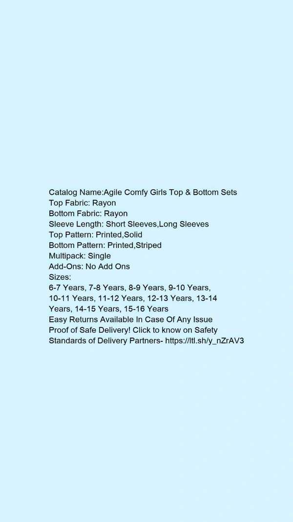 Catalog Name:*Agile Comfy Girls Top & Bottom Sets*Top Fabric: RayonBottom Fabric: RayonSleeve Length: SleevelessTop Pattern: AppliqueBottom Pattern: AppliqueMultipack: Single