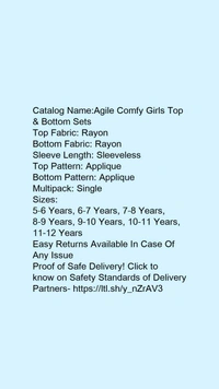 Catalog Name:*Agile Comfy Girls Top & Bottom Sets*Top Fabric: RayonBottom Fabric: RayonSleeve Length: SleevelessTop Pattern: AppliqueBottom Pattern: AppliqueMultipack: Single