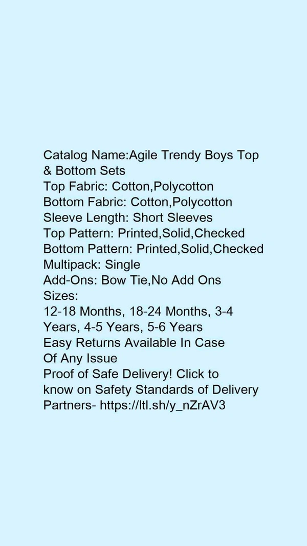 Catalog Name:*Agile Trendy Boys Top & Bottom Sets*Top Fabric: Cotton,PolycottonBottom Fabric: Cotton,PolycottonSleeve Length: Short SleevesTop Pattern: Printed,Solid,CheckedBottom Pattern: Printed,Solid,CheckedMultipack: SingleAdd-Ons: Bow Tie,No Add Ons