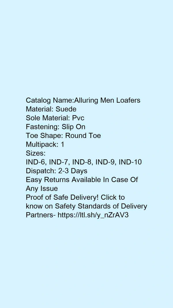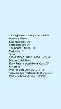Catalog Name:*Alluring Men Loafers*Material: SuedeSole Material: PvcFastening: Slip OnToe Shape: Round ToeMultipack: 1