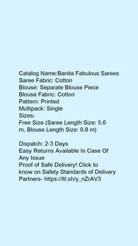 Catalog Name:*Banita Fabulous Sarees*Saree Fabric: CottonBlouse: Separate Blouse PieceBlouse Fabric: CottonPattern: PrintedMultipack: Single