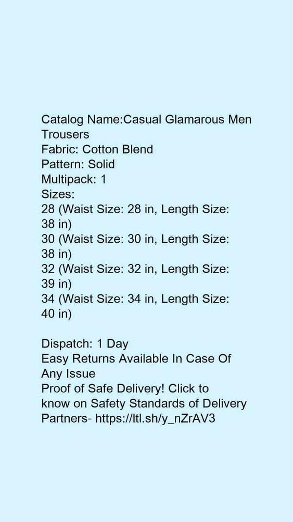 Catalog Name:*Casual Glamarous Men Trousers*Fabric: Cotton BlendPattern: SolidMultipack: 1