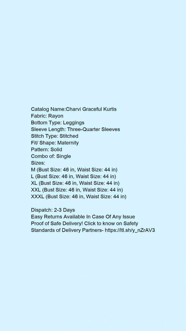 Catalog Name:*Charvi Graceful Kurtis*Fabric: RayonBottom Type: LeggingsSleeve Length: Three-Quarter SleevesStitch Type: StitchedFit/ Shape: MaternityPattern: SolidCombo of: Single