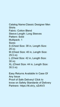 Catalog Name:*Classic Designer Men Shirts*Fabric: Cotton BlendSleeve Length: Long SleevesPattern: SolidMultipack: 1