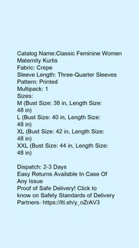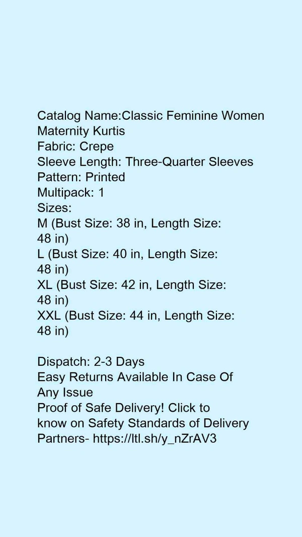 Catalog Name:*Classic Feminine Women Maternity Kurtis*Fabric: CrepeSleeve Length: Three-Quarter SleevesPattern: PrintedMultipack: 1
