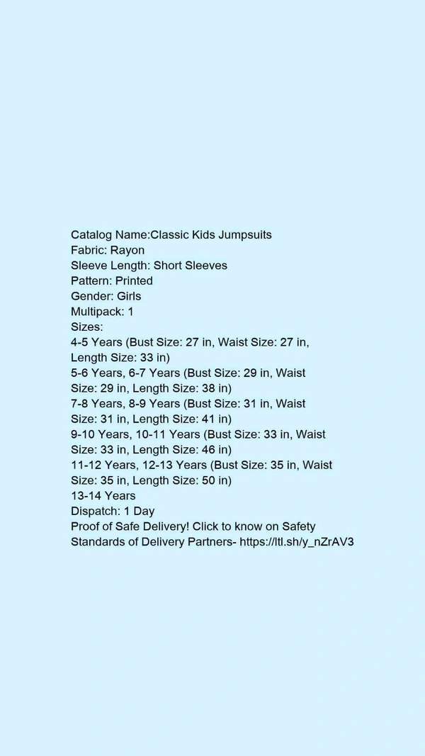 Catalog Name:*Classic Kids Jumpsuits*Fabric: RayonSleeve Length: Short SleevesPattern: PrintedGender: GirlsMultipack: 1
