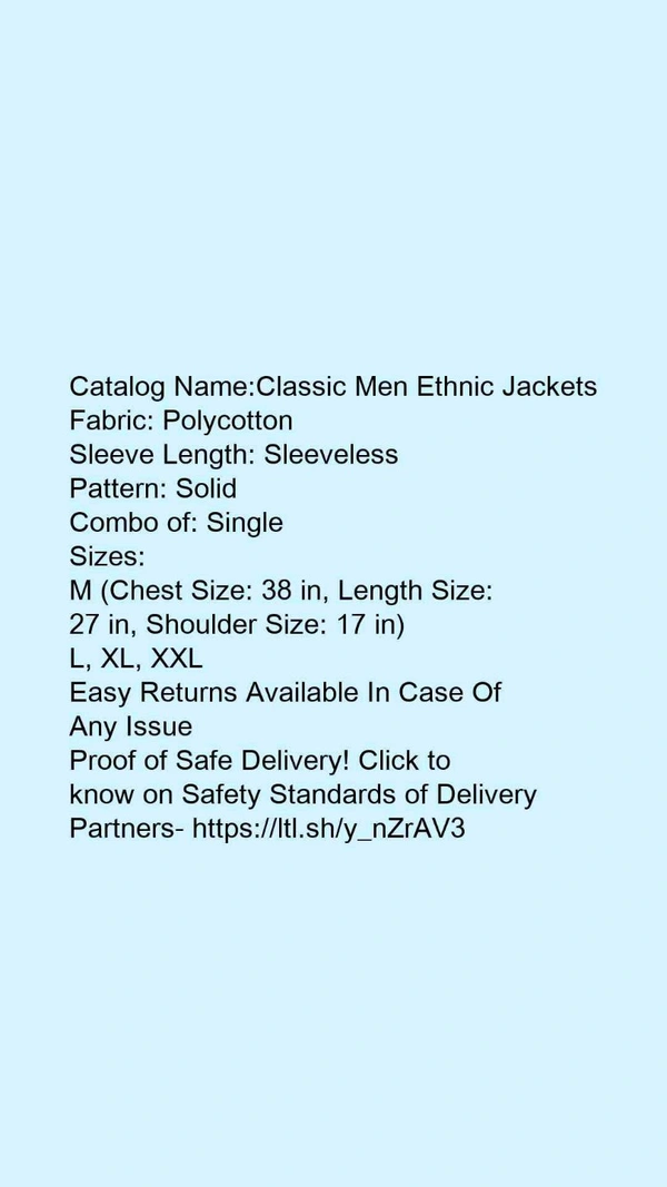 Catalog Name:*Classic Men Ethnic Jackets*Fabric: PolycottonSleeve Length: SleevelessPattern: SolidCombo of: Single