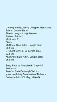 Catalog Name:*Classy Designer Men Shirts*Fabric: Cotton BlendSleeve Length: Long SleevesPattern: PrintedMultipack: 2