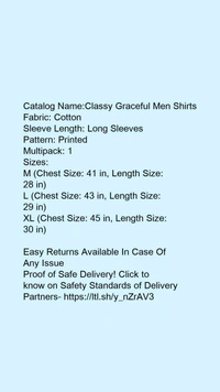Catalog Name:*Classy Graceful Men Shirts*Fabric: CottonSleeve Length: Long SleevesPattern: PrintedMultipack: 1