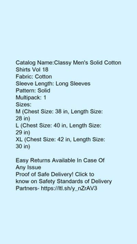 Catalog Name:*Classy Men's Solid Cotton Shirts Vol 18*Fabric: CottonSleeve Length: Long SleevesPattern: SolidMultipack: 1