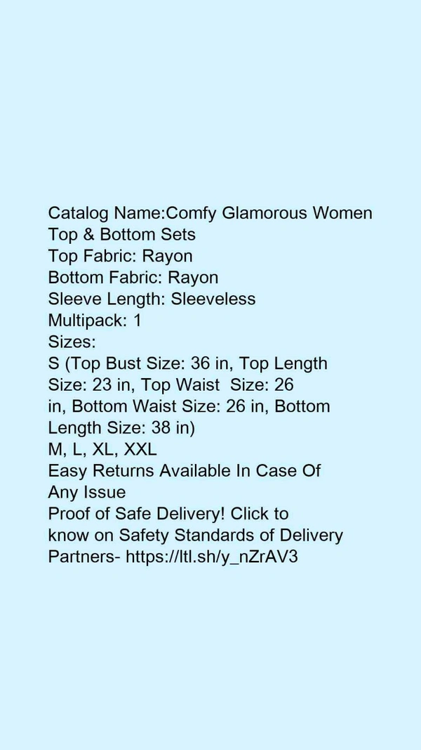 Catalog Name:*Comfy Glamorous Women Top & Bottom Sets*Top Fabric: RayonBottom Fabric: RayonSleeve Length: SleevelessMultipack: 1