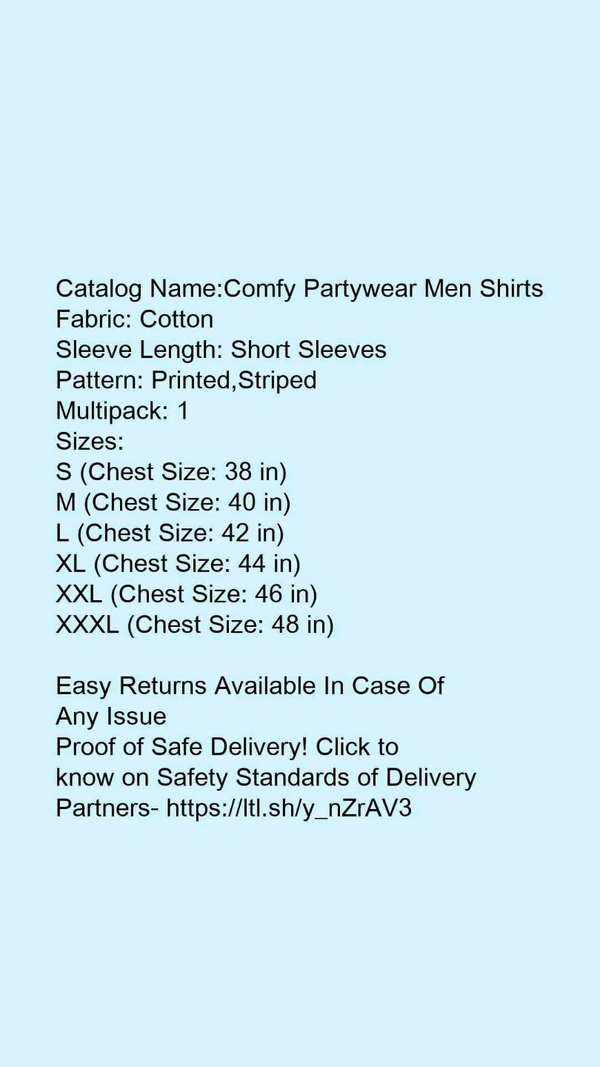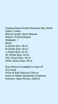 Catalog Name:*Comfy Partywear Men Shirts*Fabric: CottonSleeve Length: Short SleevesPattern: Printed,StripedMultipack: 1