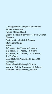 Catalog Name:*Cutiepie Classy Girls Frocks & Dresses*Fabric: Cotton BlendSleeve Length: Sleeveless,Three-Quarter SleevesPattern: Checked,Self-DesignMultipack: Single