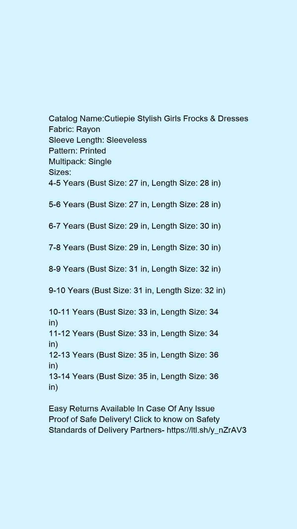 Catalog Name:*Cutiepie Stylish Girls Frocks & Dresses*Fabric: RayonSleeve Length: SleevelessPattern: PrintedMultipack: Single