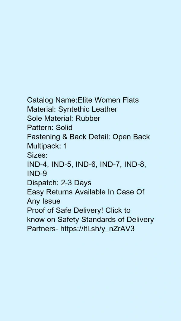 Catalog Name:*Elite Women Flats*Material: Syntethic LeatherSole Material: RubberPattern: SolidFastening & Back Detail: Open BackMultipack: 1