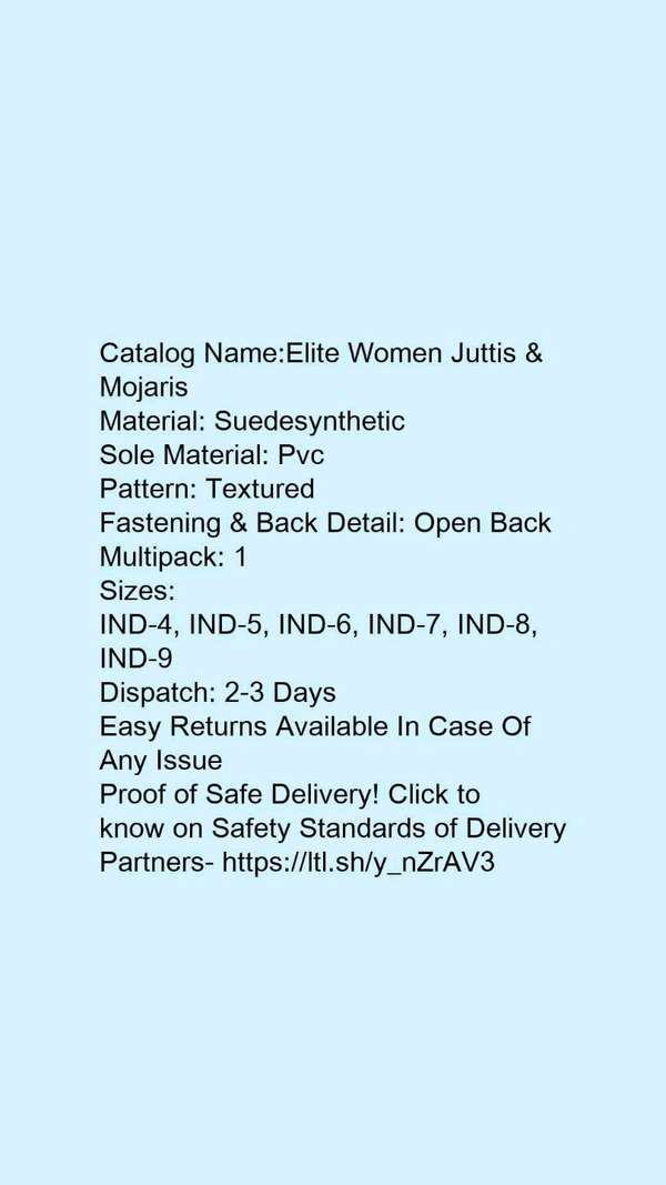 Catalog Name:*Elite Women Juttis & Mojaris*Material: SuedesyntheticSole Material: PvcPattern: TexturedFastening & Back Detail: Open BackMultipack: 1