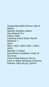Catalog Name:*Elite Women Juttis & Mojaris*Material: Syntethic LeatherSole Material: PvcPattern: SolidFastening & Back Detail: Slip-OnMultipack: 1