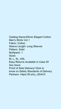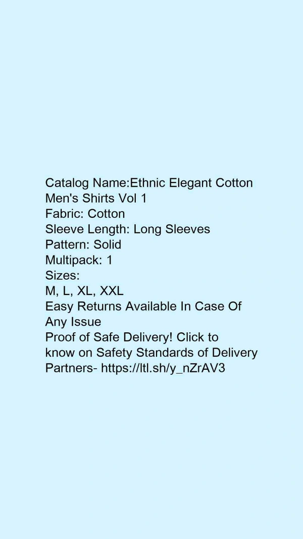 Catalog Name:*Ethnic Elegant Cotton Men's Shirts Vol 1*Fabric: CottonSleeve Length: Long SleevesPattern: SolidMultipack: 1