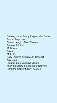 Catalog Name:*Fancy Elegant Men Shirts*Fabric: PolycottonSleeve Length: Short SleevesPattern: PrintedMultipack: 1