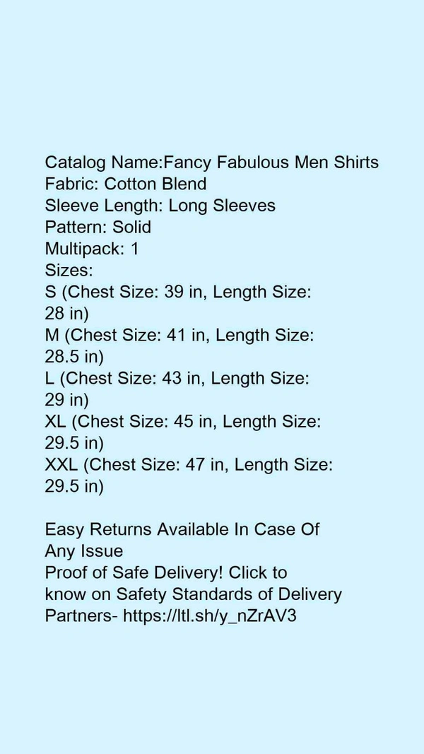 Catalog Name:*Fancy Fabulous Men Shirts*Fabric: Cotton BlendSleeve Length: Long SleevesPattern: SolidMultipack: 1