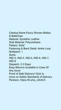 Catalog Name:*Fancy Women Bellies & Ballerinas*Material: Syntethic LeatherSole Material: PolyurethanePattern: SolidFastening & Back Detail: Ankle LoopMultipack: 1