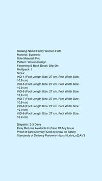 Catalog Name:*Fancy Women Flats*Material: SyntheticSole Material: PvcPattern: Woven DesignFastening & Back Detail: Slip-OnMultipack: 1
