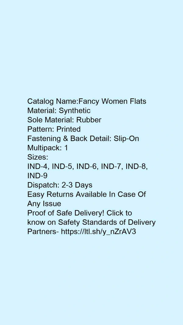 Catalog Name:*Fancy Women Flats*Material: SyntheticSole Material: RubberPattern: PrintedFastening & Back Detail: Slip-OnMultipack: 1