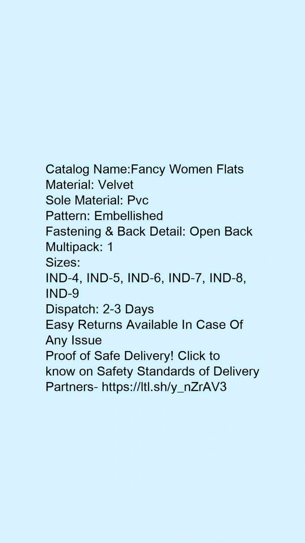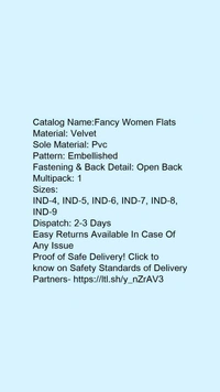 Catalog Name:*Fancy Women Flats*Material: VelvetSole Material: PvcPattern: EmbellishedFastening & Back Detail: Open BackMultipack: 1