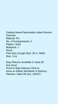 Catalog Name:*Fashionable Latest Women Clutches*Material: PUNo. of Compartments: 2Pattern: SolidMultipack: 1