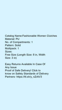 Catalog Name:*Fashionable Women Clutches*Material: PUNo. of Compartments: 1Pattern: SolidMultipack: 1