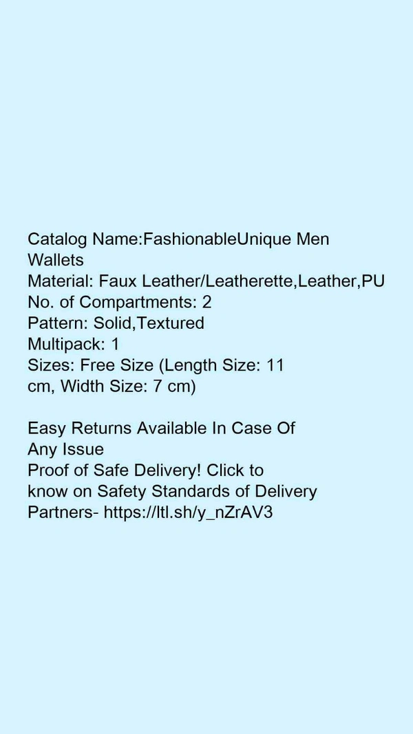 Catalog Name:*FashionableUnique Men Wallets*Material: Faux Leather/Leatherette,Leather,PUNo. of Compartments: 2Pattern: Solid,TexturedMultipack: 1