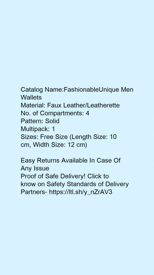 Catalog Name:*FashionableUnique Men Wallets*Material: Faux Leather/LeatheretteNo. of Compartments: 4Pattern: SolidMultipack: 1