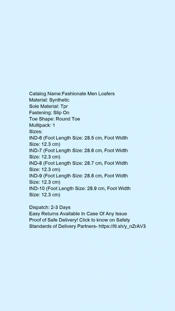 Catalog Name:*Fashionate Men Loafers*Material: SyntheticSole Material: TprFastening: Slip OnToe Shape: Round ToeMultipack: 1