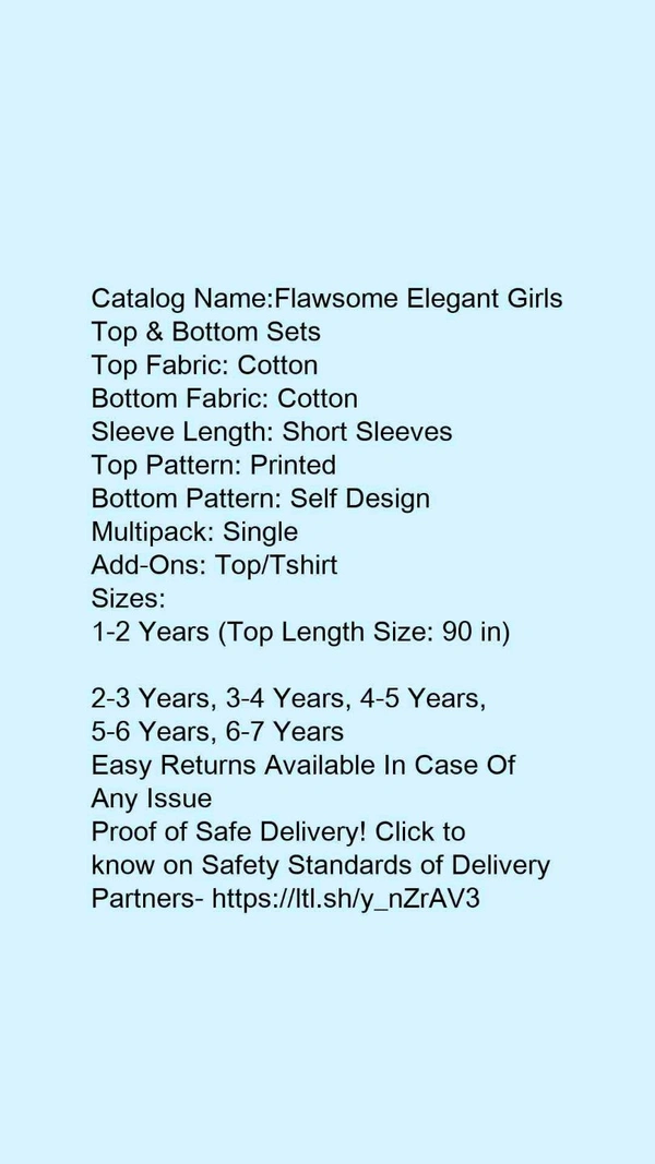 Catalog Name:*Flawsome Elegant Girls Top & Bottom Sets*Top Fabric: CottonBottom Fabric: CottonSleeve Length: Short SleevesTop Pattern: PrintedBottom Pattern: Self DesignMultipack: SingleAdd-Ons: Top/Tshirt