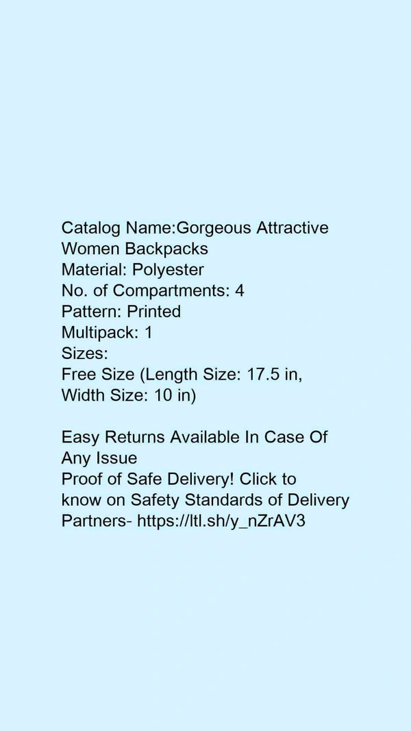 Catalog Name:*Gorgeous Attractive Women Backpacks*Material: PolyesterNo. of Compartments: 4Pattern: PrintedMultipack: 1