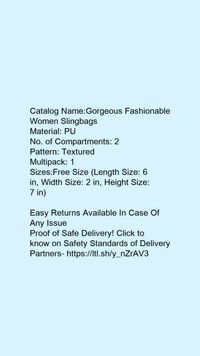 Catalog Name:*Gorgeous Fashionable Women Slingbags*Material: PUNo. of Compartments: 2Pattern: TexturedMultipack: 1