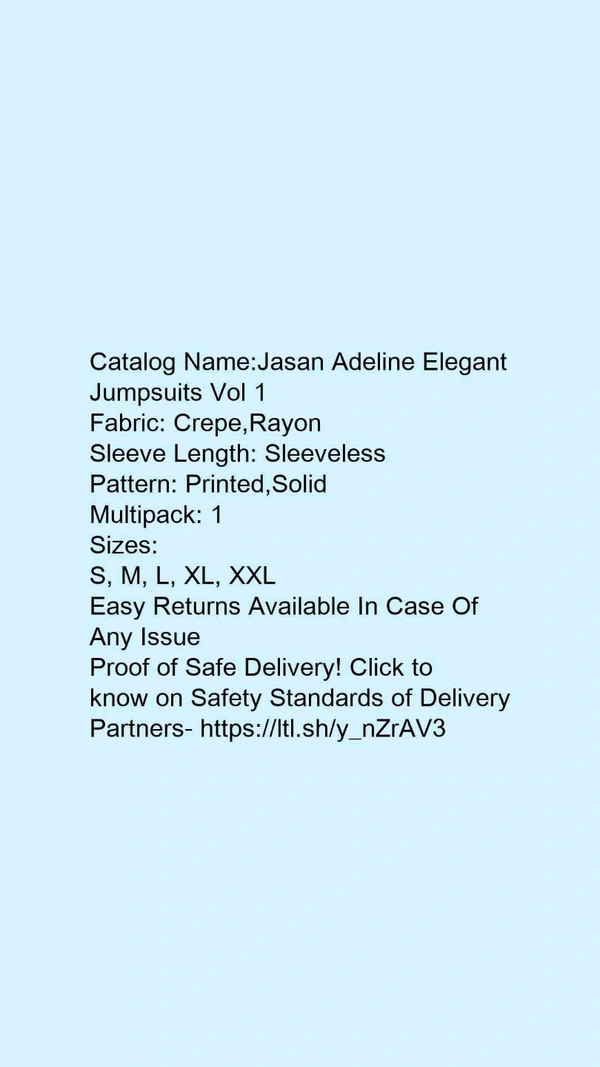 Catalog Name:*Jasan Adeline Elegant Jumpsuits Vol 1*Fabric: Crepe,RayonSleeve Length: SleevelessPattern: Printed,SolidMultipack: 1