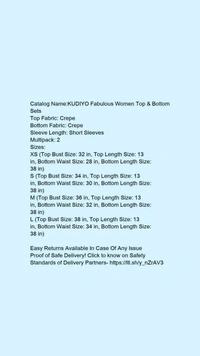 Catalog Name:*KUDIYO Fabulous Women Top & Bottom Sets*Top Fabric: CrepeBottom Fabric: CrepeSleeve Length: Short SleevesMultipack: 2