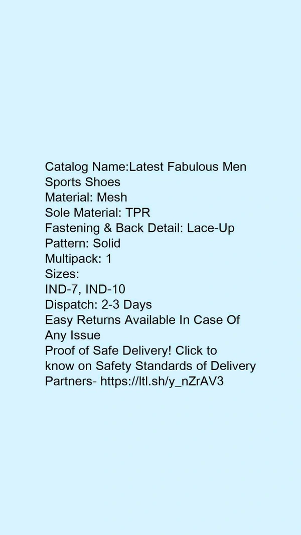 Catalog Name:*Latest Fabulous Men Sports Shoes*Material: MeshSole Material: TPRFastening & Back Detail: Lace-UpPattern: SolidMultipack: 1