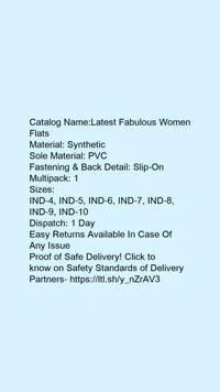 Catalog Name:*Latest Fabulous Women Flats*Material: SyntheticSole Material: PVCFastening & Back Detail: Slip-OnMultipack: 1