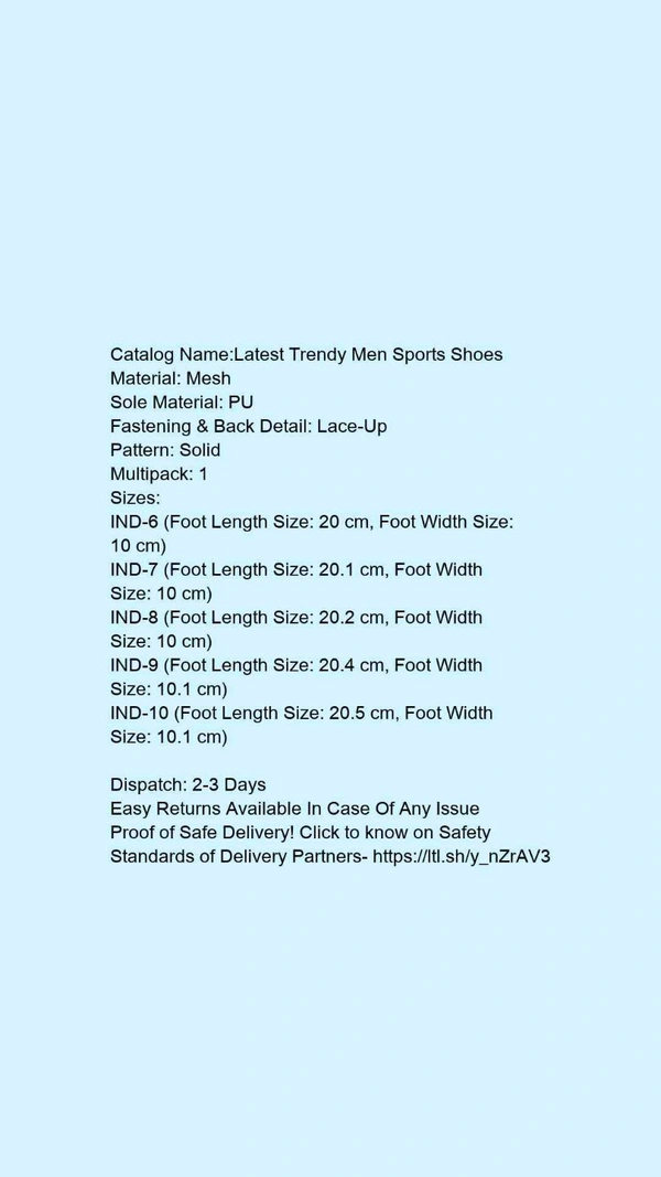 Catalog Name:*Latest Trendy Men Sports Shoes*Material: MeshSole Material: PUFastening & Back Detail: Lace-UpPattern: SolidMultipack: 1