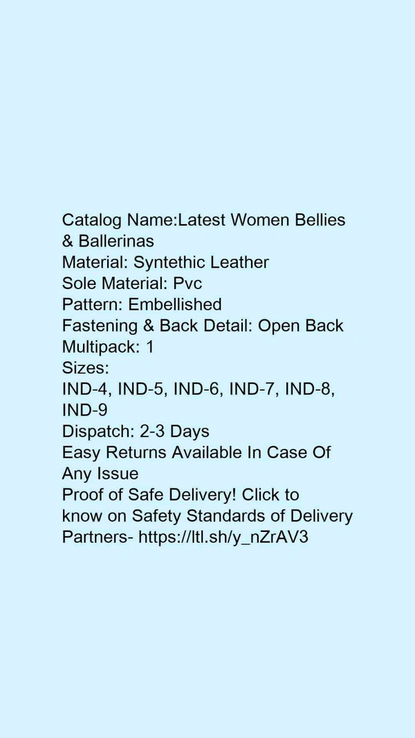 Catalog Name:*Latest Women Bellies & Ballerinas*Material: Syntethic LeatherSole Material: PvcPattern: EmbellishedFastening & Back Detail: Open BackMultipack: 1