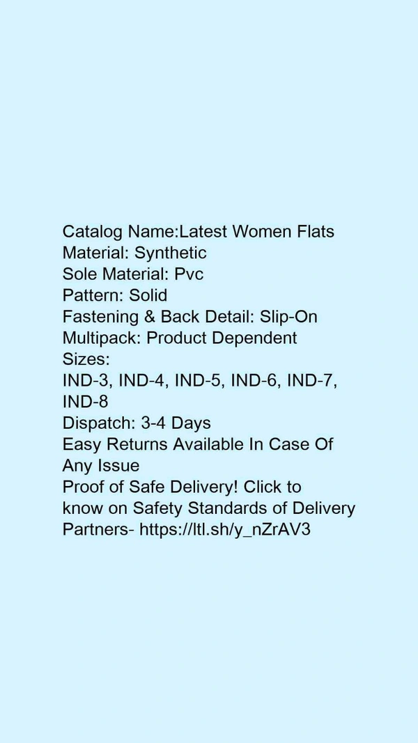 Catalog Name:*Latest Women Flats*Material: SyntheticSole Material: PvcPattern: SolidFastening & Back Detail: Slip-OnMultipack: Product Dependent