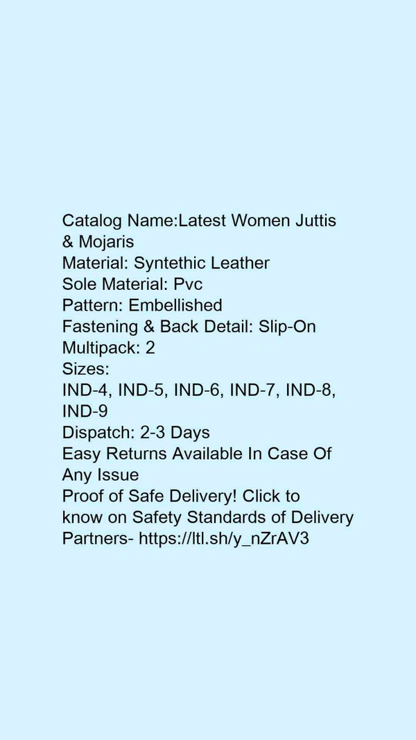 Catalog Name:*Latest Women Juttis & Mojaris*Material: Syntethic LeatherSole Material: PvcPattern: EmbellishedFastening & Back Detail: Slip-OnMultipack: 2