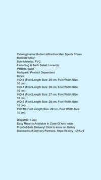 Catalog Name:*Modern Attractive Men Sports Shoes*Material: MeshSole Material: PVCFastening & Back Detail: Lace-UpPattern: SolidMultipack: 2